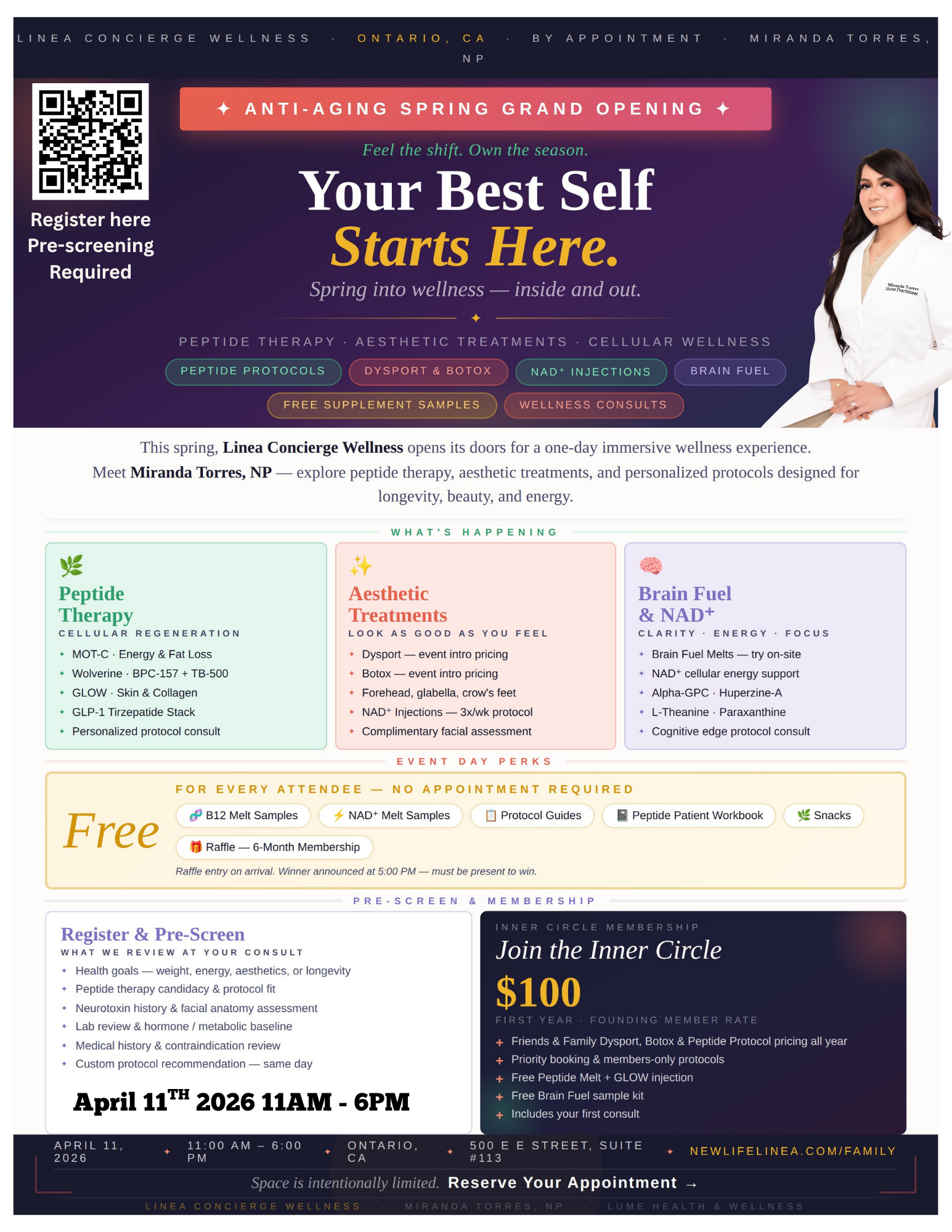 By invite, we welcome you to our exclusive launch event, with family only pricing. If you have ever wanted to try Botox or Dysport nows your chance. April 11th, 2026 from 11AM confirm your spot by registering below. Join us to celebrate the opening of the clinic in Ontario! If you are a vendor and interested in joining us that day please register at the bottom of the page. Looking forward to seeing you there.